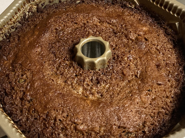 Add all ingredients in the above steps to make a batter. Line (with parchment paper) and liberally grease two 9″ bake pans. Press 1/4 inch layer of brown sugar onto the bottom of each pan.